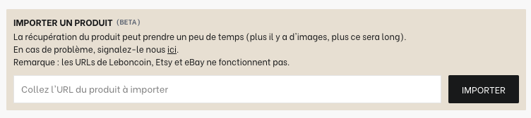 L'import via url ne fonctionne pas sur les sites grand public qui bloquent ou filtrent les bots et scrapers (ex : LeBonCoin ou Etsy)